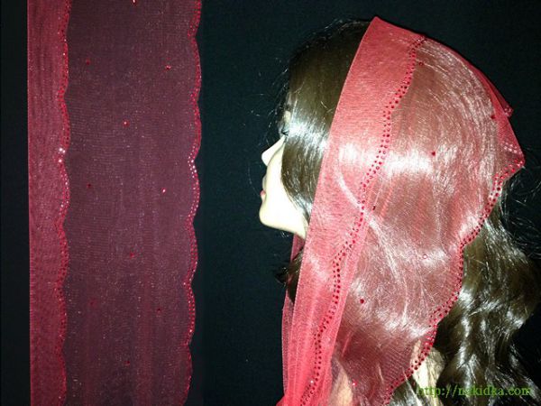 | Красный фатиновый шарф с наклееным красными камушками, волнистым ободком и наклееным по его контуру красным узором |