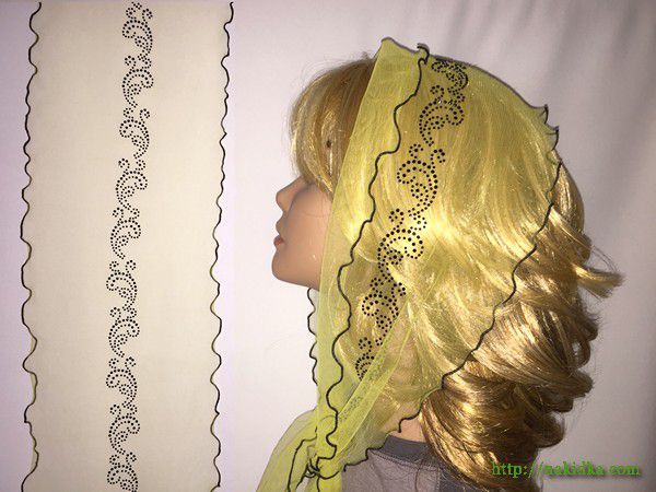 | Желтый легкий фатиновый шарф с черным наклееным узором и черным волнистым ободком |