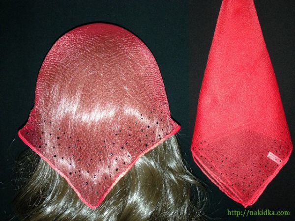 | Красная однотонная нейлоновая косынка с наклееными черными камушками |