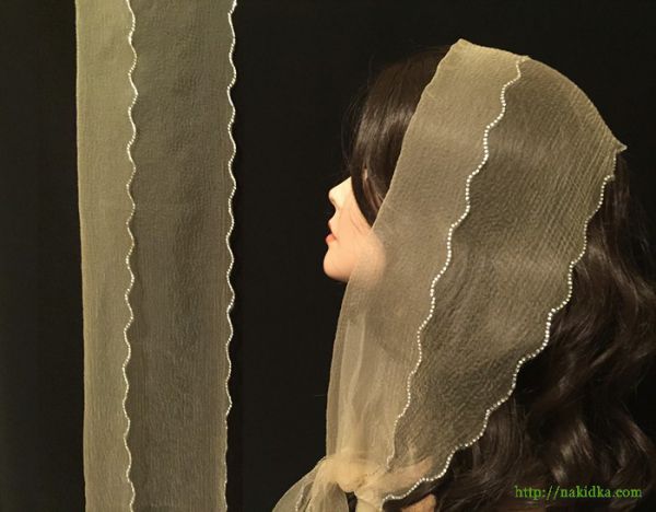 | Желто-бежевый нейлоновый шарф с наклееными блестящими камушками по волнистому ободку |