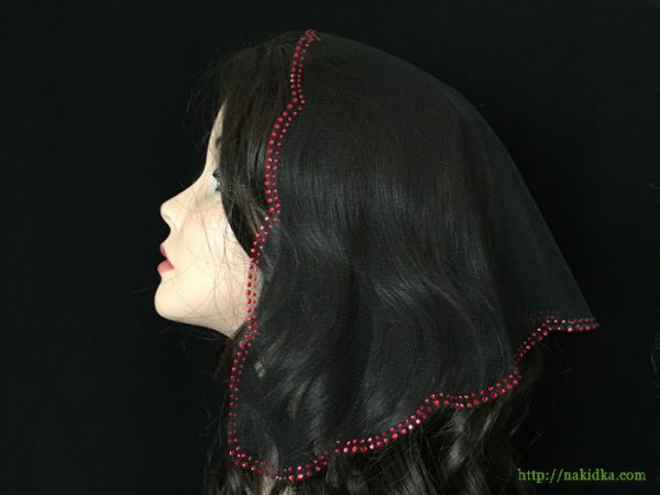 | Черная фатиновая накидка с волнистой кромкой с наклееным по ее контуру красным узором |