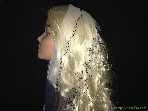 | Белый с черным фатиновый шарф с волнистым ободком и наклееным черным узором |