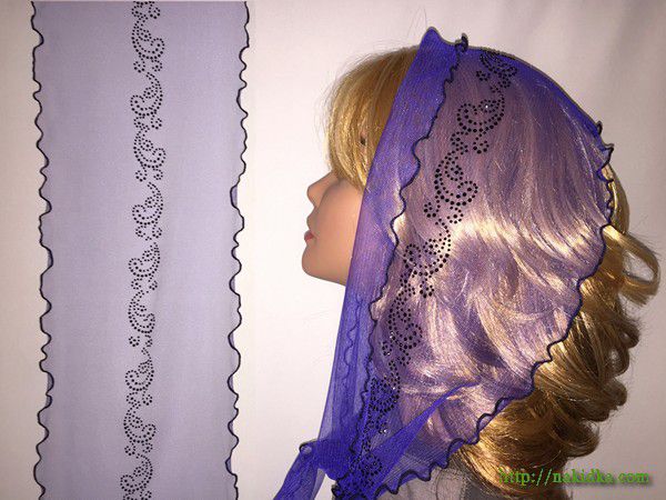 | Сине-фиолетовый фатиновый шарф с наклееным черным узором и черным волнистым ободком |