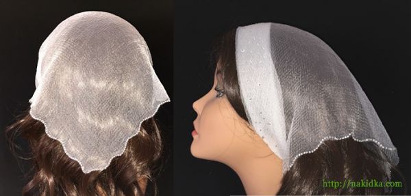 | Белая однотонная нейлоновая косынка с наклееными камушками на подвернутой и подклееной передней стороне и блестящими камушками на волнистой кромке на задней стороне |