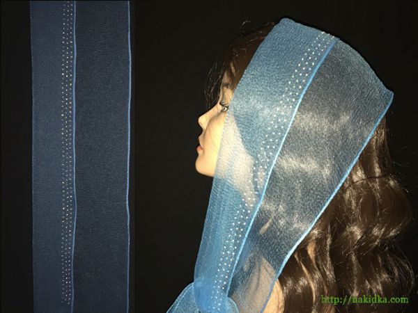 | Голубой нейлоновый шарф с наклееным блестящим серебристым узором |