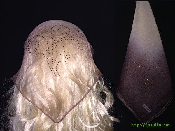| Бежевая с коричневым двутонная нейлоновая косынка с наклееным золотистым узором |