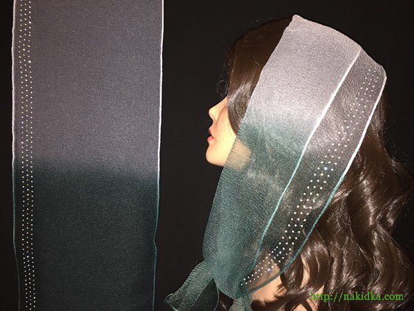 | Утененный белый с темно-зеленым нейлоновый шарф с наклееным перламутровым узором |