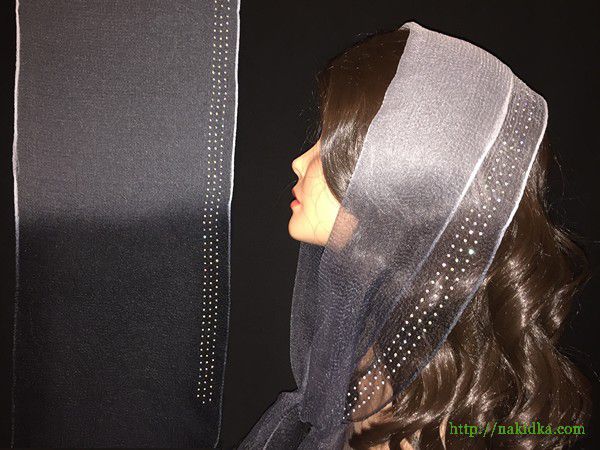 | Утененный белый с черным нейлоновый шарф с наклееным перламутровым узором |