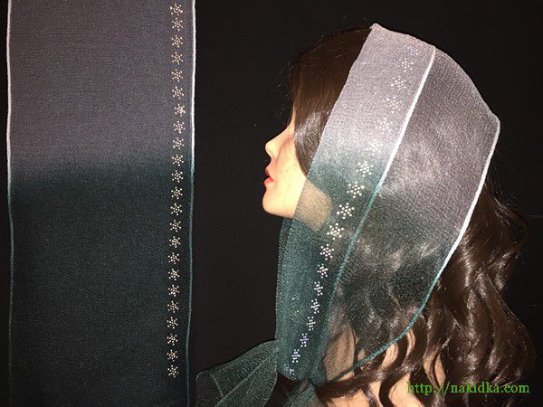 | Утененный белый с темно-зеленым нейлоновый шарф с наклееным перламутровым узором |