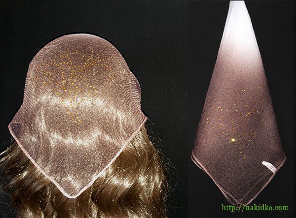 | Белая с коричневым нейлоновая косынка с наклееным золотистым узором |