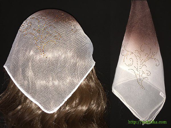 | Коричневая с белым двутонная нейлоновая косынка с наклееным золотистым узором |