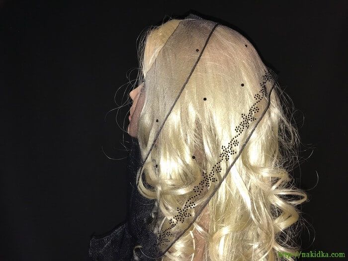 | Черный нейлоновый шарф с наклееными черным узором и черными камушками |