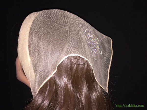 | Абрикосовая однотонная нейлоновая косынка с наклееными камушками на подвернутой и подклееной передней стороне и блестящим узором на задней стороне |