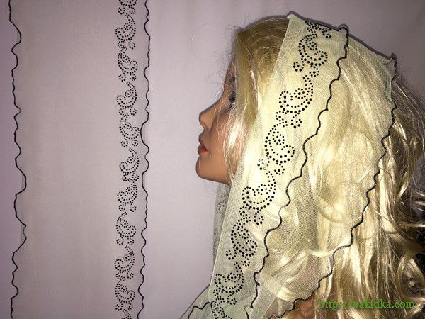 | Зелено-желтый фатиновый шарф с наклееными черным узором и черным волнистым ободком |