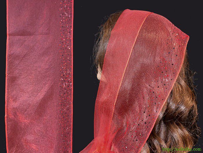 | Красный нейлоновый шарф с наклееными красными и черными камушками |