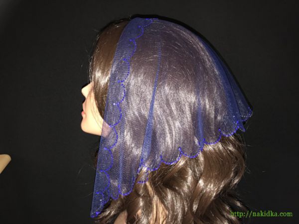 | Темно-синяя легкая фатиновая накидка с наклеенным синим узором по вырезанному краю |