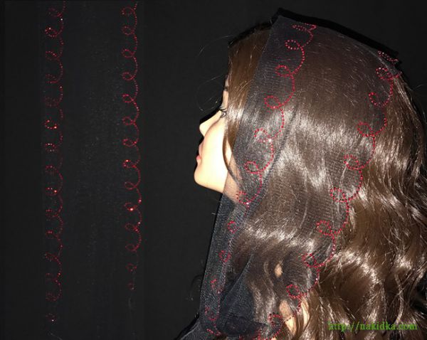 | Черный легкий фатиновый шарф с наклееным красным узором и волнистым вырезанным ободком |