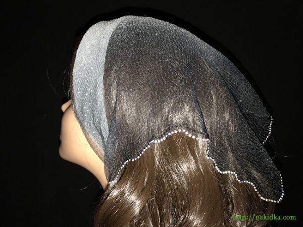 | Белая с черным двухтонная косынка с блестящими узорами на подвернутом крае и на волнистом ободке |