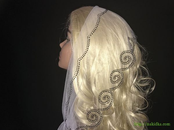 | Белый легкий фатиновый шарф с наклеенными черными узорами и вырезанным ободком |