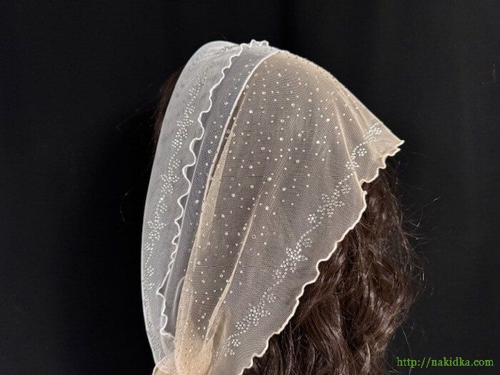 | Белый с абрикосовым двутонный фатиновый шарф с наклееным блестящим узором и волнистым ободком |