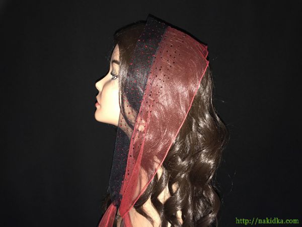 | Черный с красным двутонный фатиновый шарф с наклееными черными и красными камушками и прямым ободком |