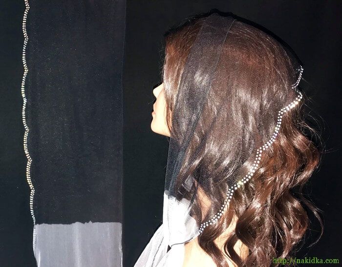 | Черный с белым фатиновый шарф с волнистым ободком и наклееным блестящим узором |