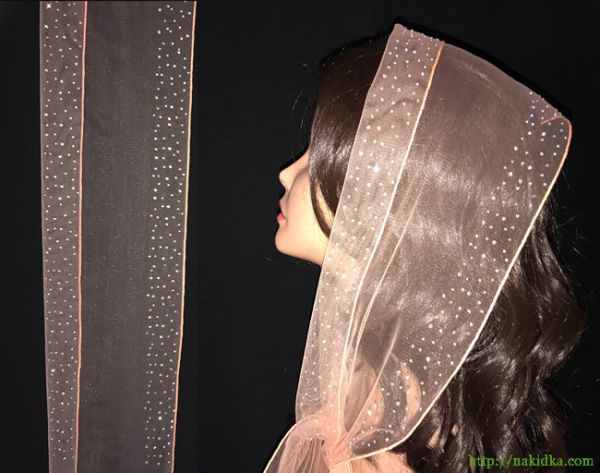 | Персиковый легкий фатиновый шарф с наклееными блестящими камушками |