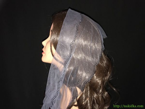 | Серый легкий фатиновый шарф с наклееным черным узором и вырезанным ободком |