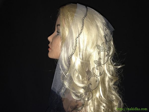 | Серый с черным легкий фатиновый шарф с наклееным черным узором и волнистым вырезанным ободком |