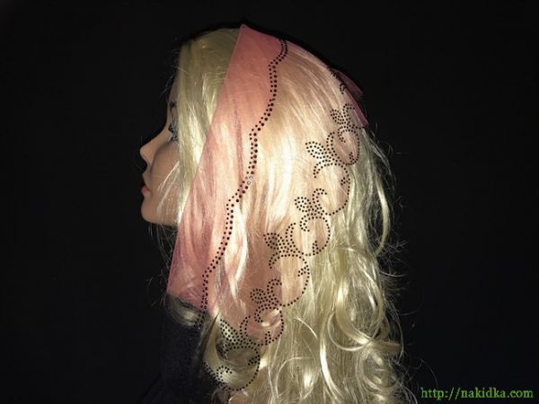 | Коралловый с черным легкий фатиновый шарф с наклееными черными камешками и волнистым ободком |