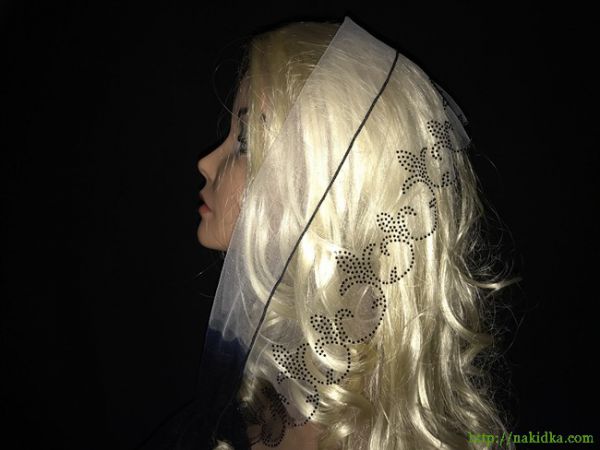 | Белый с черным фатиновый шарф с волнистым ободком и наклееным черным узором |