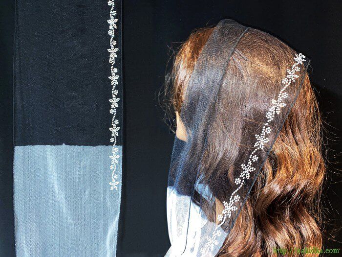 | Белый с черным легкий фатиновый шарф с наклееными блестящими камушками |