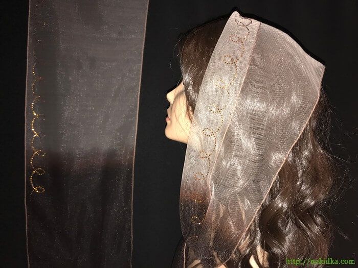 | Кофейный с коричневым легкий фатиновый шарф с наклееным золотистым узором |