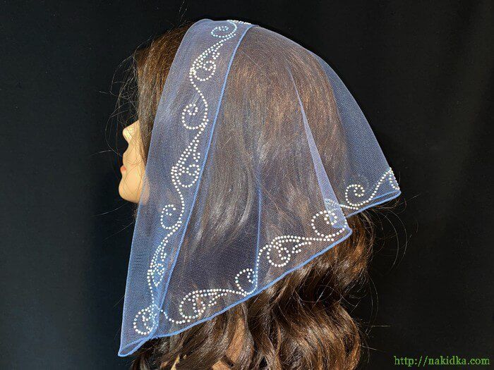 | Серо-фиолетовая легкая фатиновая накидка с наклееными блестящими камушками и узором по краю |