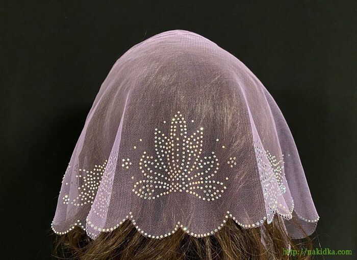 | Светло-фиолетовая легкая фатиновая накидка с наклееным блестящим перламутровым узором и узором на ободке |