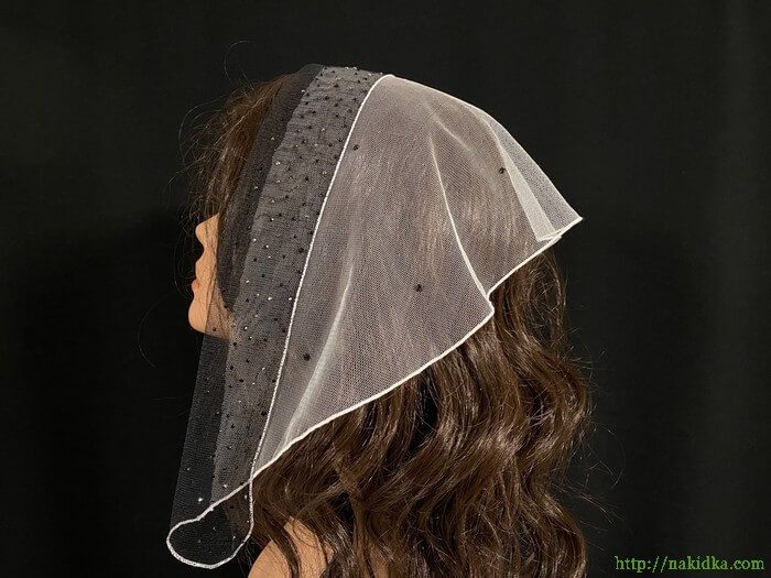 | Бeлая с черным фатиновая накидка с наклееными камушками и с подвернутой передней кромкой |
