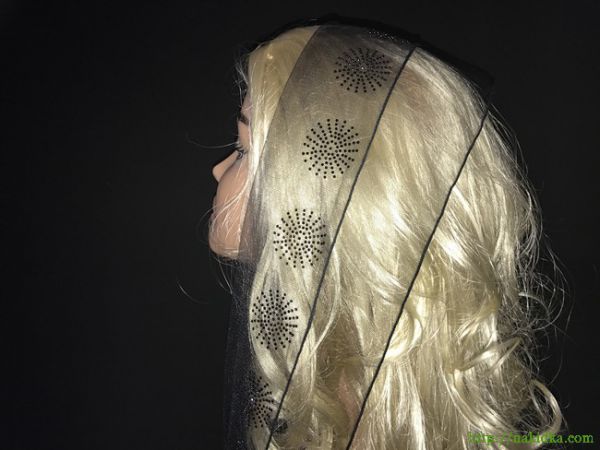 | Черный легкий фатиновый шарф с наклеенным черным узором и прямым ободком |