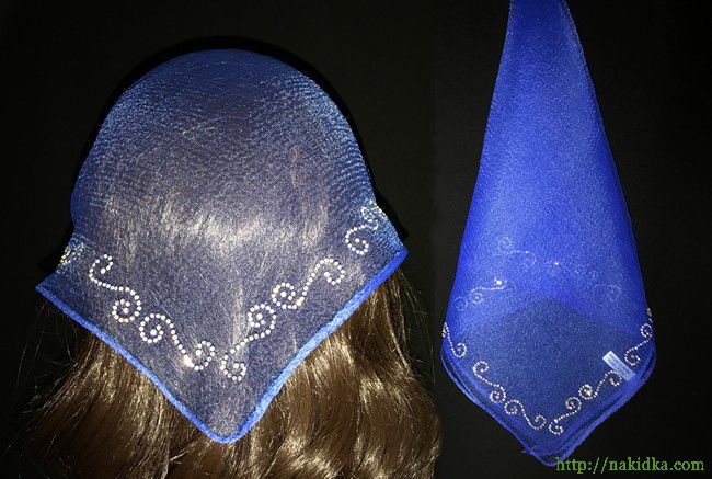 | Синяя нейлоновая косынка с наклеенным блестящим завитым узором |