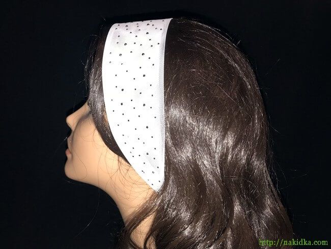 | Белый однотонный фатиновый шарф-полоска с наклеенными серыми блестящими камушками |