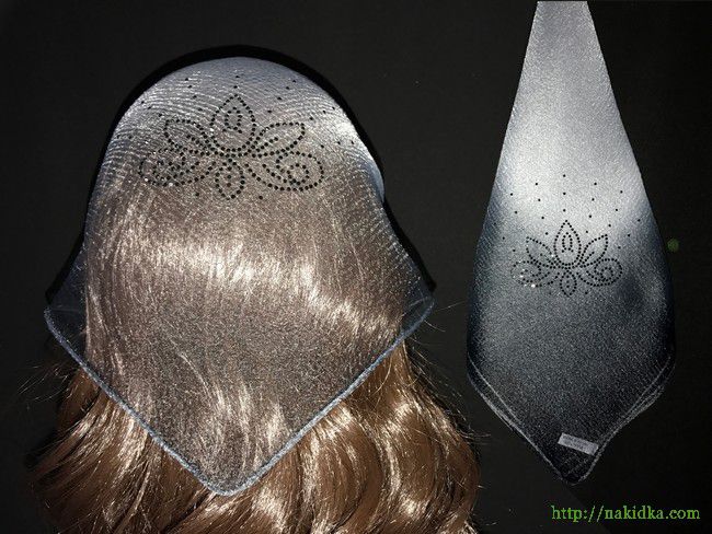 | Серая с черными краями нейлоновая косынка с наклеенным черным узором |