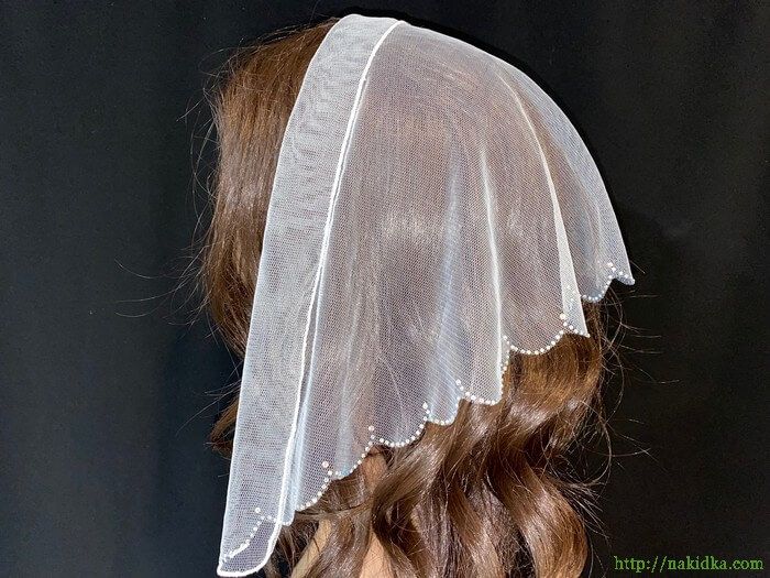 | Белая легкая фатиновая накидка с волнистой кромкой и наклееными по заднему контуру блестящим узором |