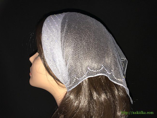 | Серая однотонная нейлоновая косынка с наклеенным блестящим узором сзади и на ободке для подворачивания |