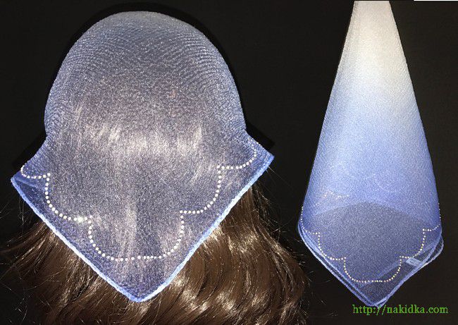 | Белая с голубым утененная косынка с наклеенным волнистым узорoм по краям |