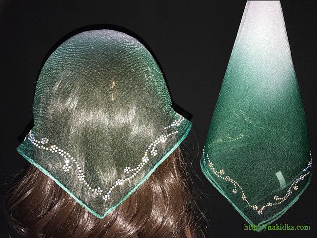 | Белая с темно-зеленым утененная косынка с наклеенным узором веточкой по краям |