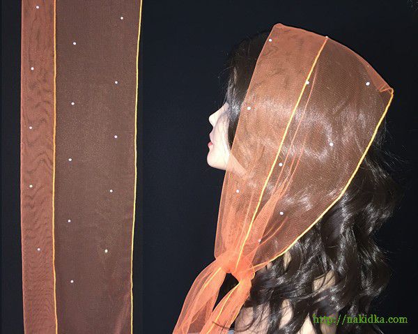 | Оранжевый легкий фатиновый шарф с наклееными блестящими камушками и ровным ободком |