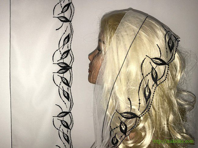 | Белый легкий фатиновый шарф с черным вышитым узором |