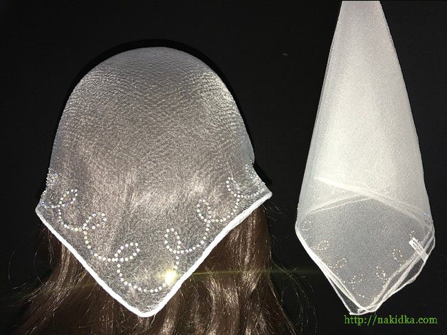 | Белая однотонная нейлоновая косынка с наклеенным блестящим узором |