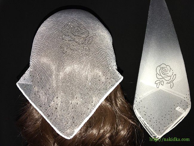 | Серая с белым двухтонная нейлоновая косынка с наклеенным серым узором розочкой и серыми камушками по краям |