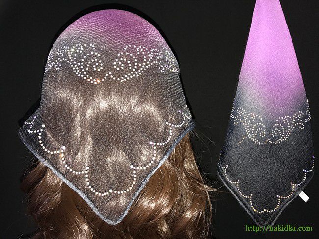 | Светло-фиолетовая с черным двухтонная косынка с наклеенным блестящим узорoм двумя веточками и волнистым узором на краю |