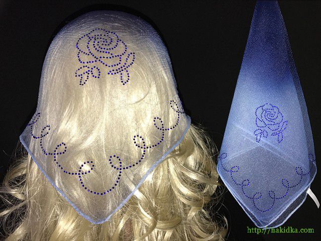 | Синяя с голубым двухтонная косынка с наклеенным синим узорoм розочкой и синим волнистым узором по краю |